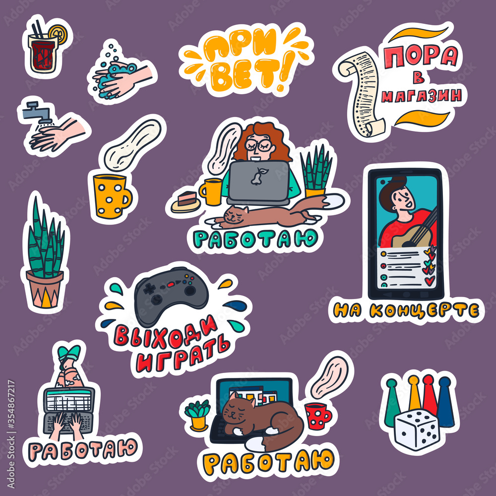 Self Isolation At Home Stickers Set For Social Media Bullet Journal Etc Quarantine Routine At Home Work From Home Office Stay Positive Russian Titles Stock Vector Adobe Stock